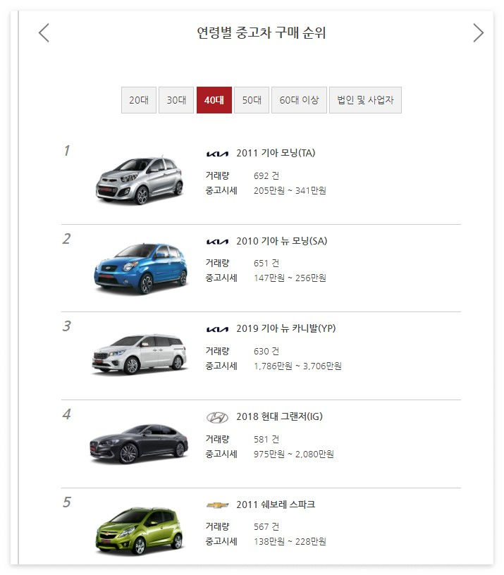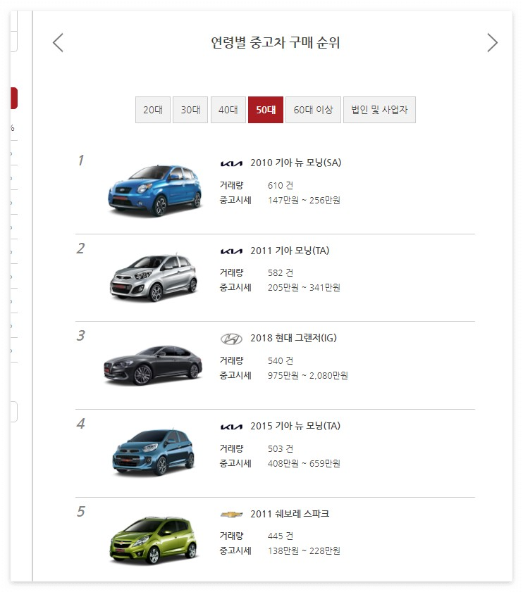 연령별 중고차 구매 순위도 보여주며 20대, 30대, 40대, 50대, 60대 구매 차량은 물론 법인 및 사업자 차량까지 한눈에 정리되도록 간편하게 되어있습니다.