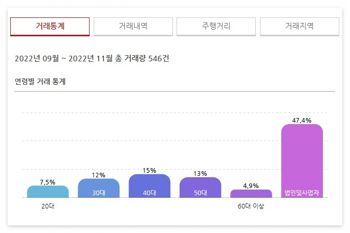 연령별 거래 통계를 막대 그래프로 나타내주어 중고차 시세와 트렌드를 알기 편하다는 장점이 있습니다.