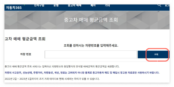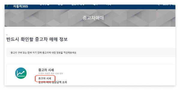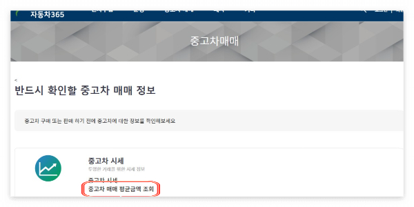자동차 365 홈페이지 접속 후 중고차 매매 평균금액 조회를 클릭합니다.