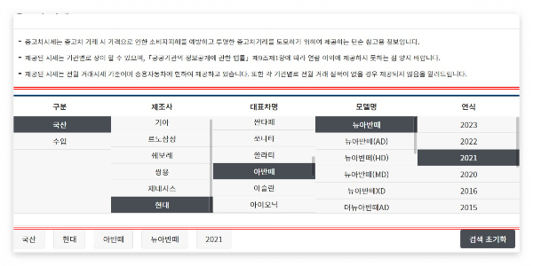 위 사진 처럼 원하는 차량이 있다면 구분, 제조사, 대표자명, 모델명, 연식 등 세부정보를 선택합니다.